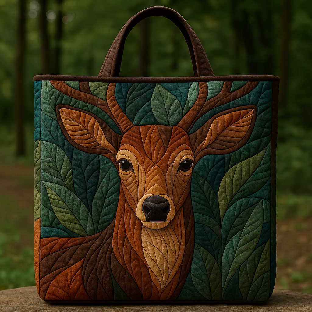 Calm, earthy, and beautifully crafted — this forest deer quilted tote bag brings woodland elegance into your everyday life. The deer is rendered with layered quilted texture, using warm browns and caramel tones, while the surrounding leaves in deep greens and teals create a rich, nature-filled backdrop.
