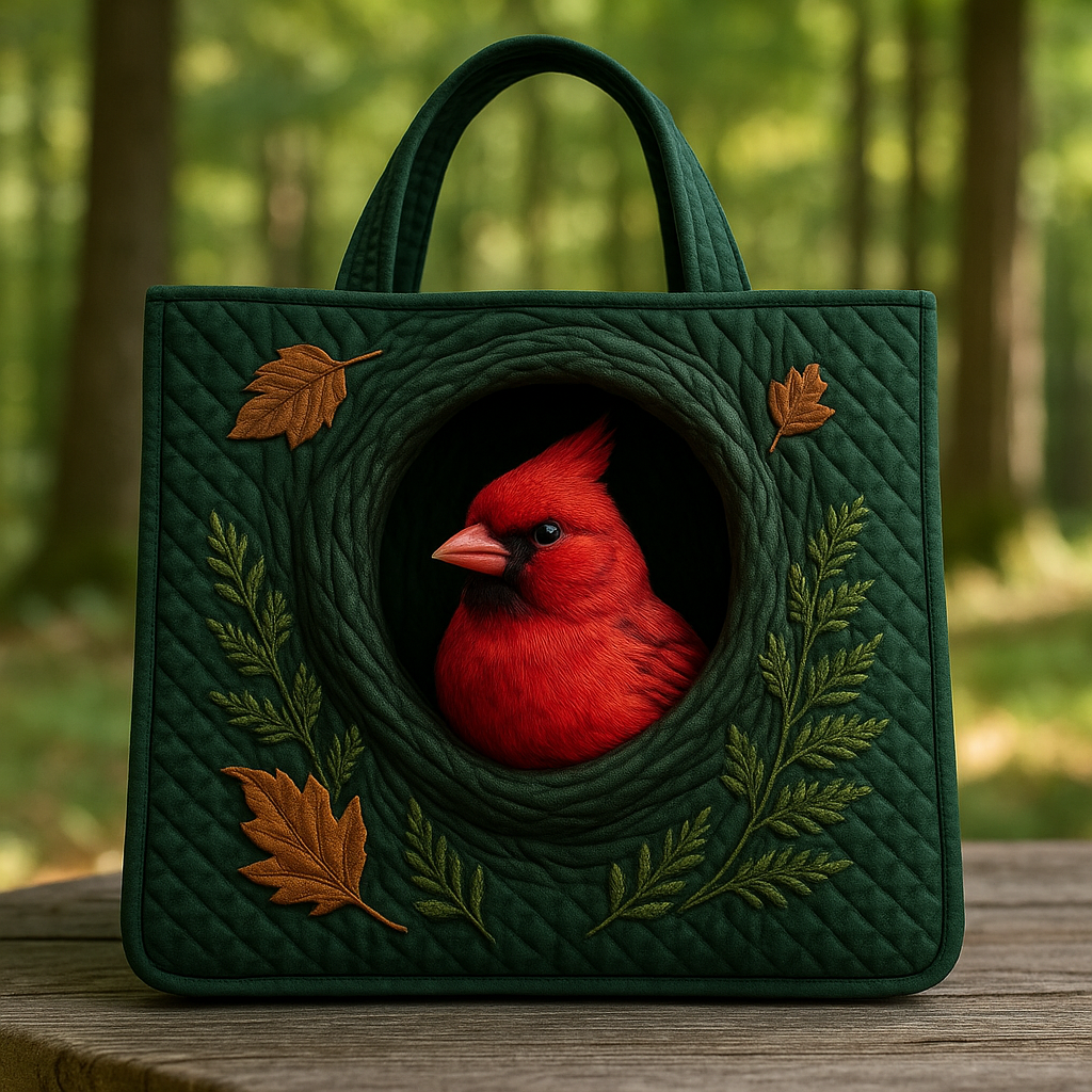 The deep green quilted base, autumn leaf details, and vibrant red cardinal create a warm, seasonal contrast perfect for everyday outfits, farmers’ market trips, autumn strolls, or nature-themed occasions. Lightweight, sturdy, and visually captivating, it brings creativity and comfort wherever you go.