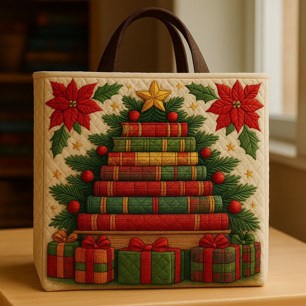 This Storybook Christmas Tree Quilted Tote Bag transforms classic holiday spirit into a charming, book-lover’s dream. Each embroidered book becomes a “branch,” forming a cozy Christmas tree crowned with a shining star. Wrapped presents, poinsettias, holly leaves, and golden stitched stars complete the festive scene, making the whole design feel like a page lifted from a whimsical winter tale.